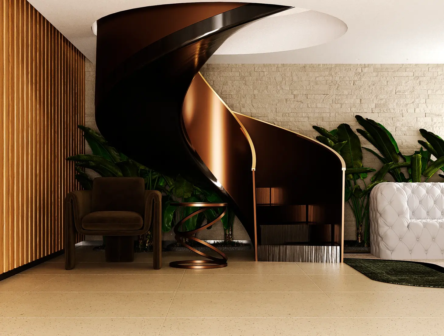 A escada em espiral, verdadeira escultura funcional, é o ápice da experiência estética — revestida com acabamento metálico em cobre, ela conecta os pavimentos com fluidez e dramaticidade, evocando a sensualidade das curvas modernistas de Niemeyer, reinterpretadas com linguagem contemporânea e autoral.