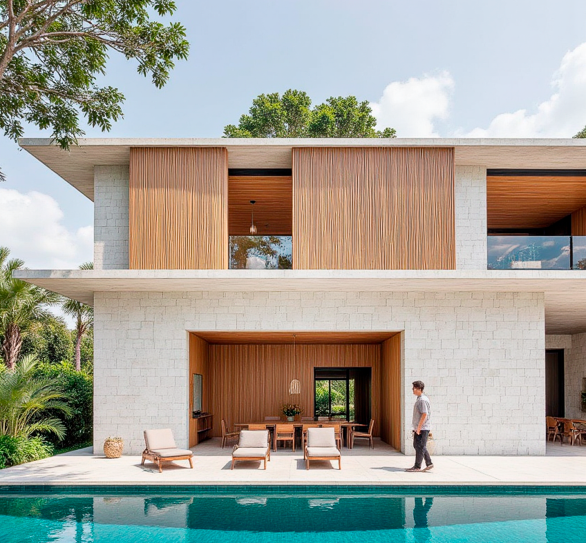 Desde a fachada, os dois imponentes ciprestes italianos marcam a identidade do projeto, trazendo verticalidade e imponência ao volume principal. A madeira ripada, aplicada de forma precisa e sofisticada, recebe um tratamento chanfrado a 45 graus, criando um jogo de luz e sombra que dá movimento e profundidade à composição. Esse detalhe não é apenas estético, mas também funcional, trazendo uma sensação de leveza à robustez da estrutura.